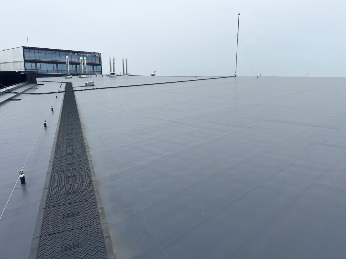 The NZICC roof is a RoofLogic Ultratherm Xtreme warm roof system. It features a single-layer FiberTite membrane with walkway tiles for maintenance traffic. The standard buildup includes a FiberTite XT membrane over a 13mm roof board substrate, on 60mm PIR and 40mm stonewool insulation, supported by the RL BaseDeck. In areas requiring structural or slope adaptations, the system is FiberTite over tapered PIR boards or directly on concrete. Gutters and sumps are integrated with the membrane, and plant platforms are designed to support all services without additional sleepers.