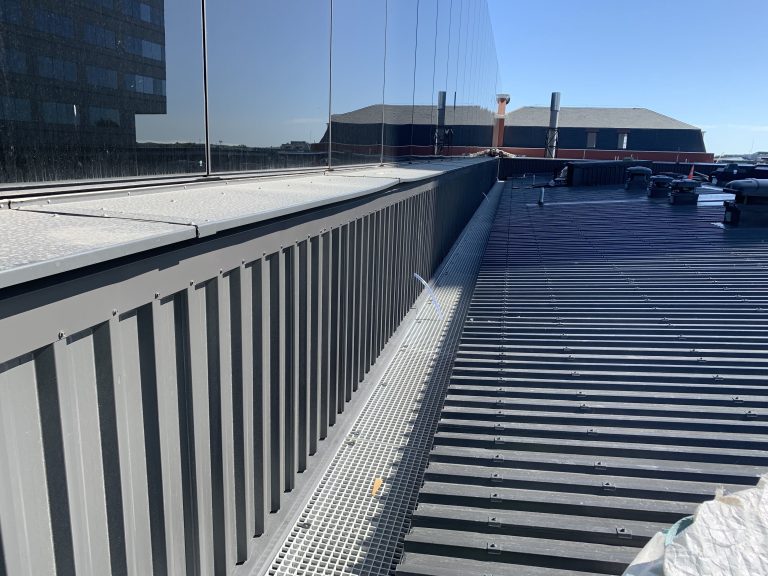Other roofing areas follow variations of this system. The Administration area uses a FibreTite membrane, similar to the material in the internal gutters.