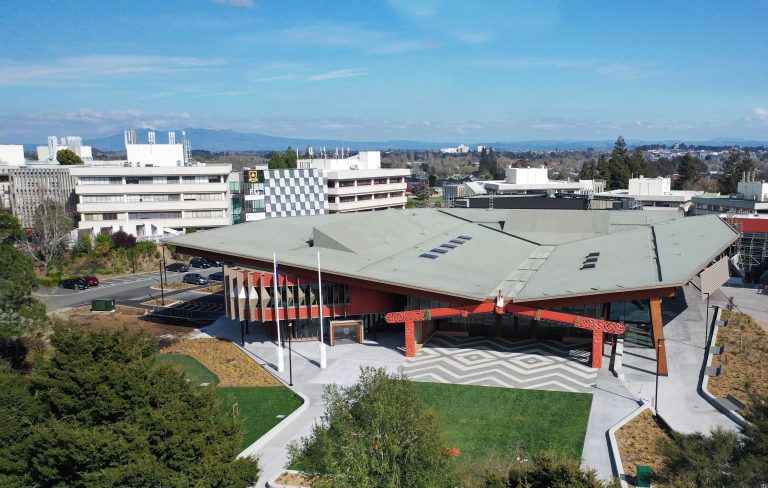 The Pā, a striking new structure at University of Waikato’s Hamilton campus, is now officially open. Designed by a collaboration between Jasmax, Architectus, and DesignTribe, this landmark building boasts colossal wooden glulam beams – some of the largest engineered in New Zealand – serving as the structural foundation for the membrane roof.